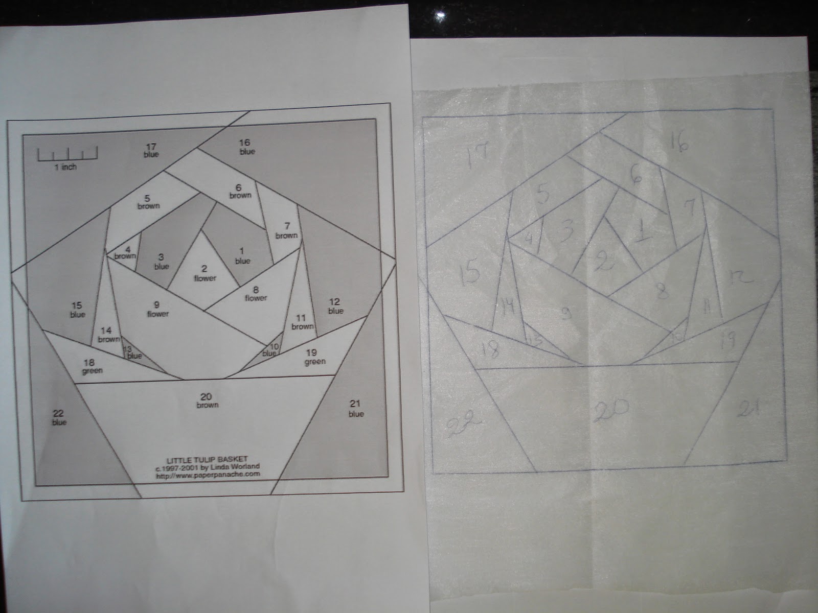 1. Copie o molde em uma folha de papel ou entretela (melhor) - essa "base " é chamada de foundation.