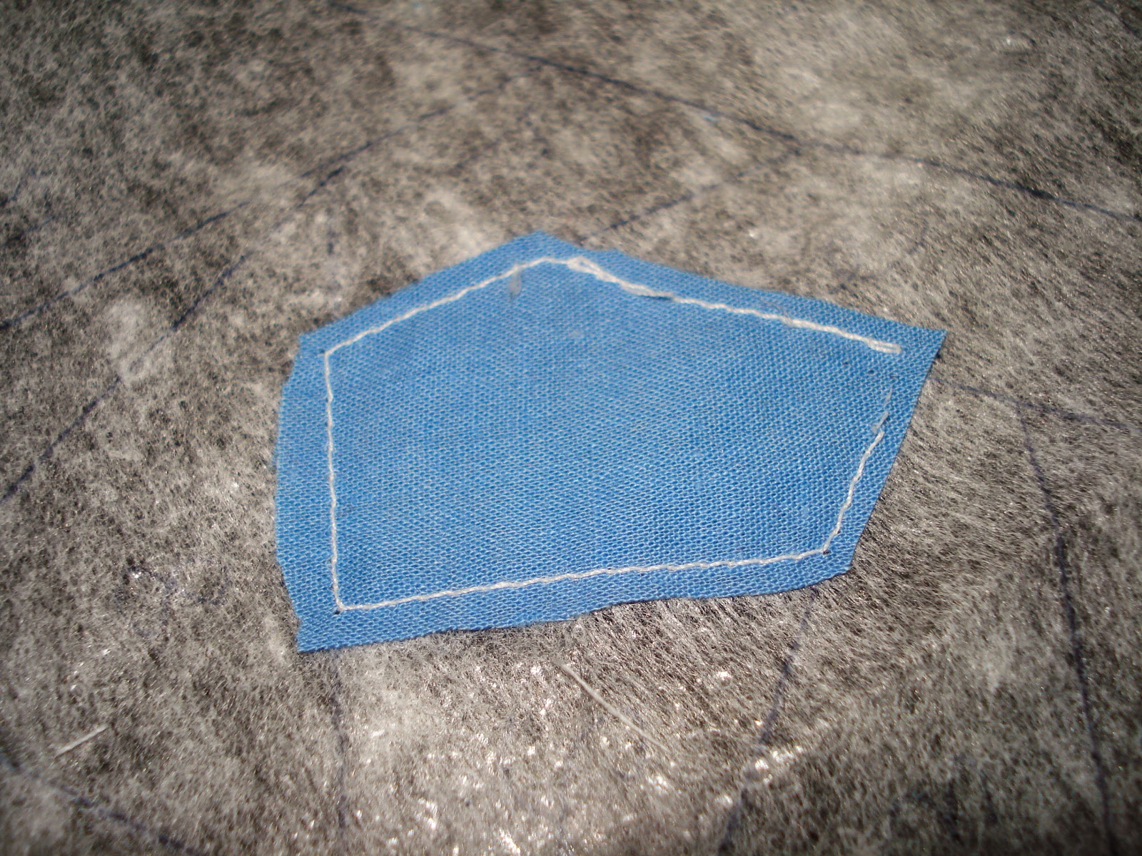 Para iniciar, posicionamos um pedacinho de tecido sobre o primeiro número (avesso) e fazemos uma costura contornando todo o desenho (usar lado direito da entretela).