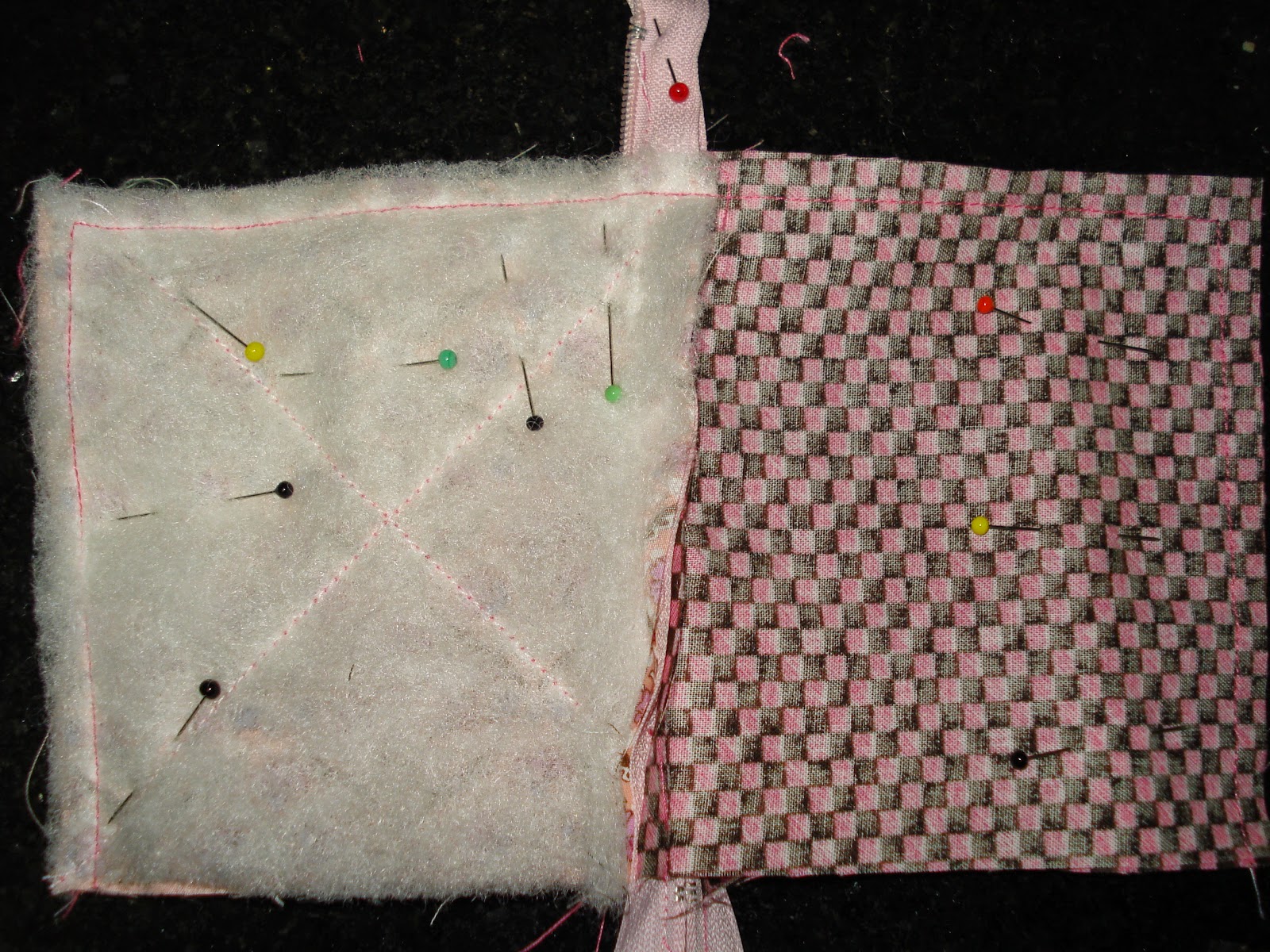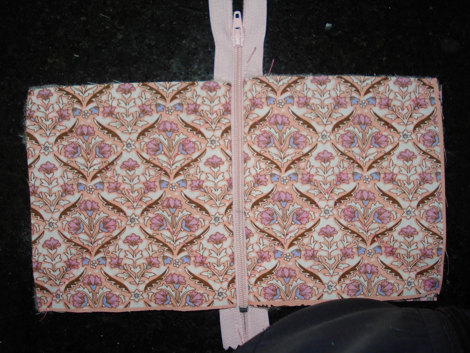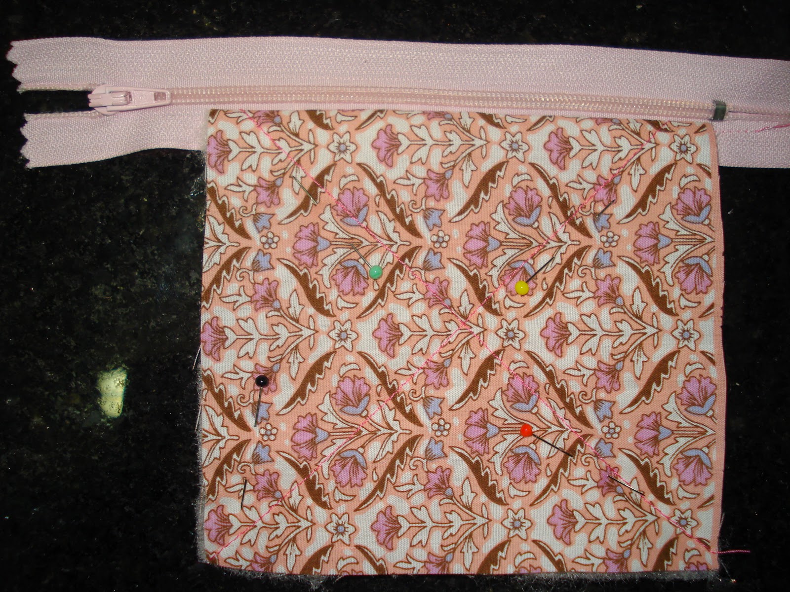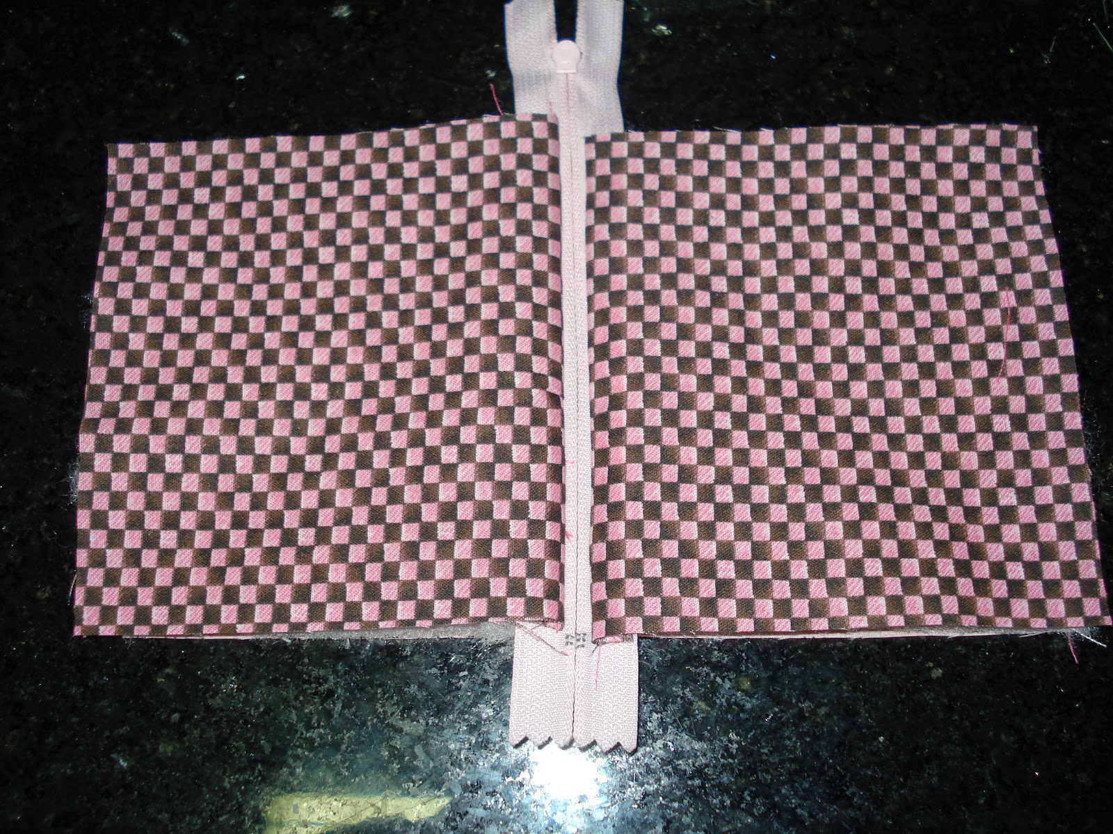 2. Fixar o quadrado de tecido 1 e o forro de tecido 2 ao zíper.