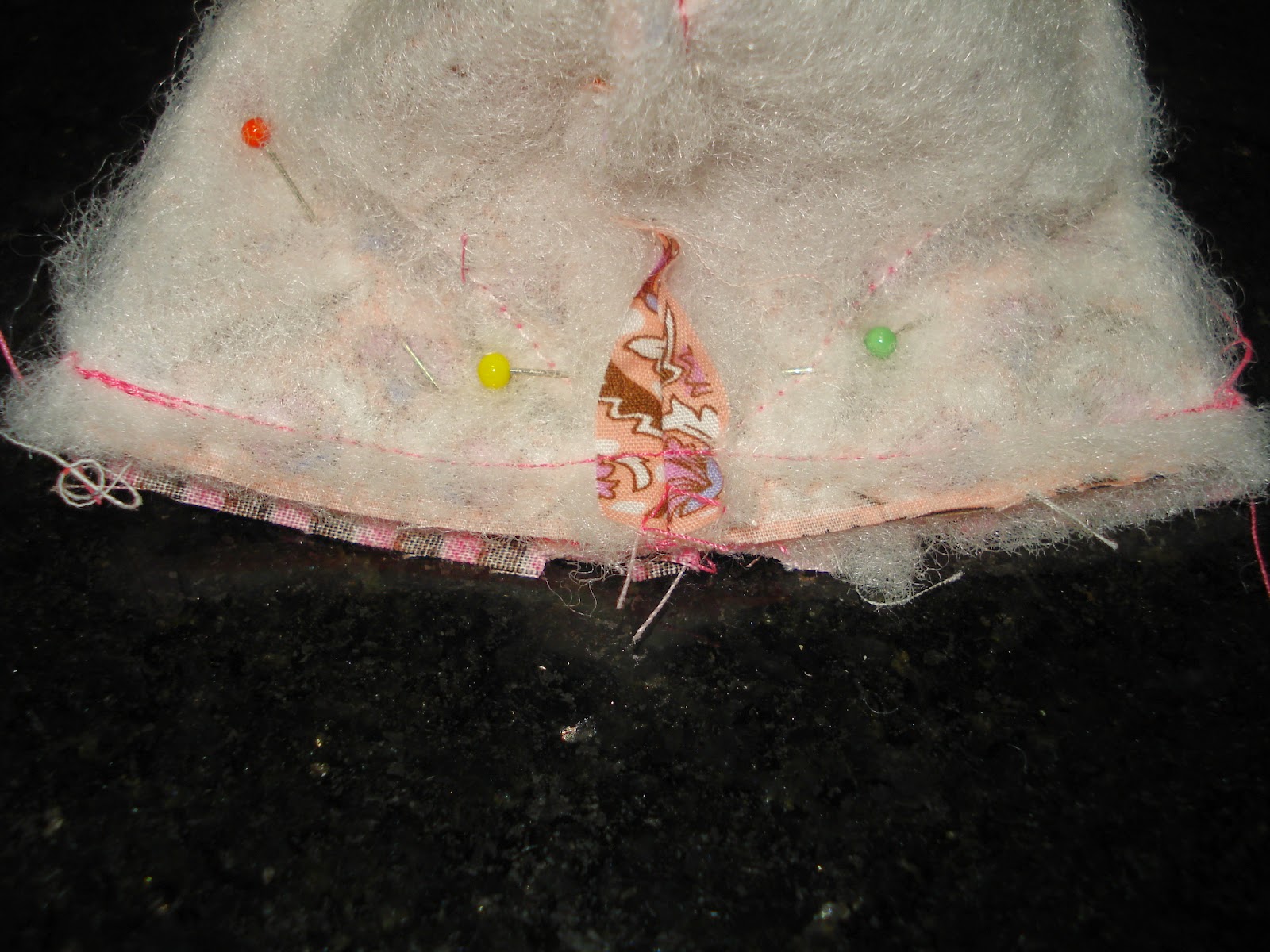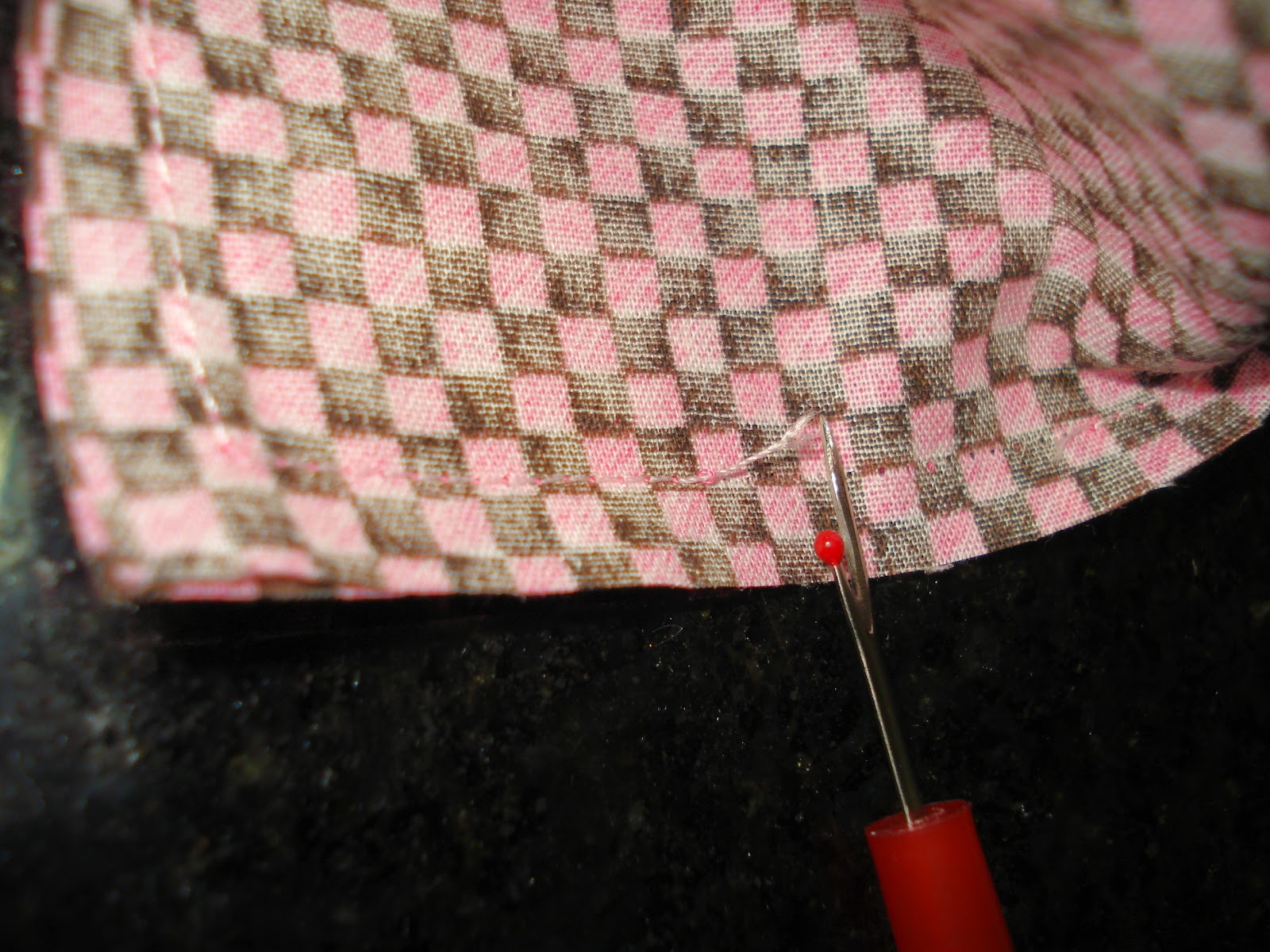 9. Com pontinho invisível, feche a abertura no forro do trabalho (tecido2).