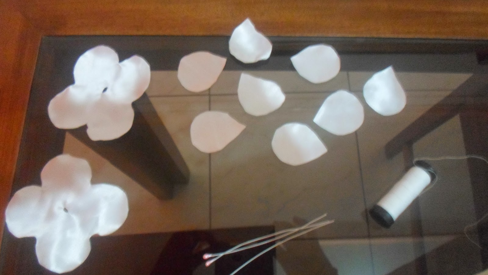 1. Faça 8 pétalas de aproximadamente 4cm e 2 desenhos  em forma de flor, usando o tecido (neste caso foi usado o cetim).