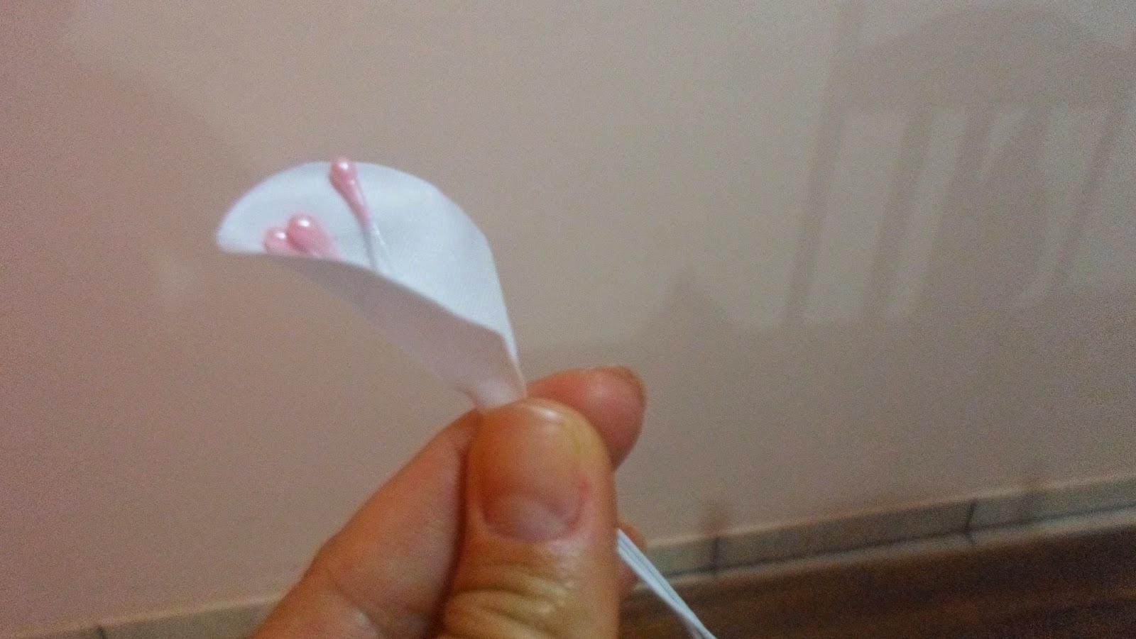3. Junte três araminhos com pistilo e enrole pétala por pétala, prendendo na base com várias laçadas de linha de costura, para que fiquem bem presas.