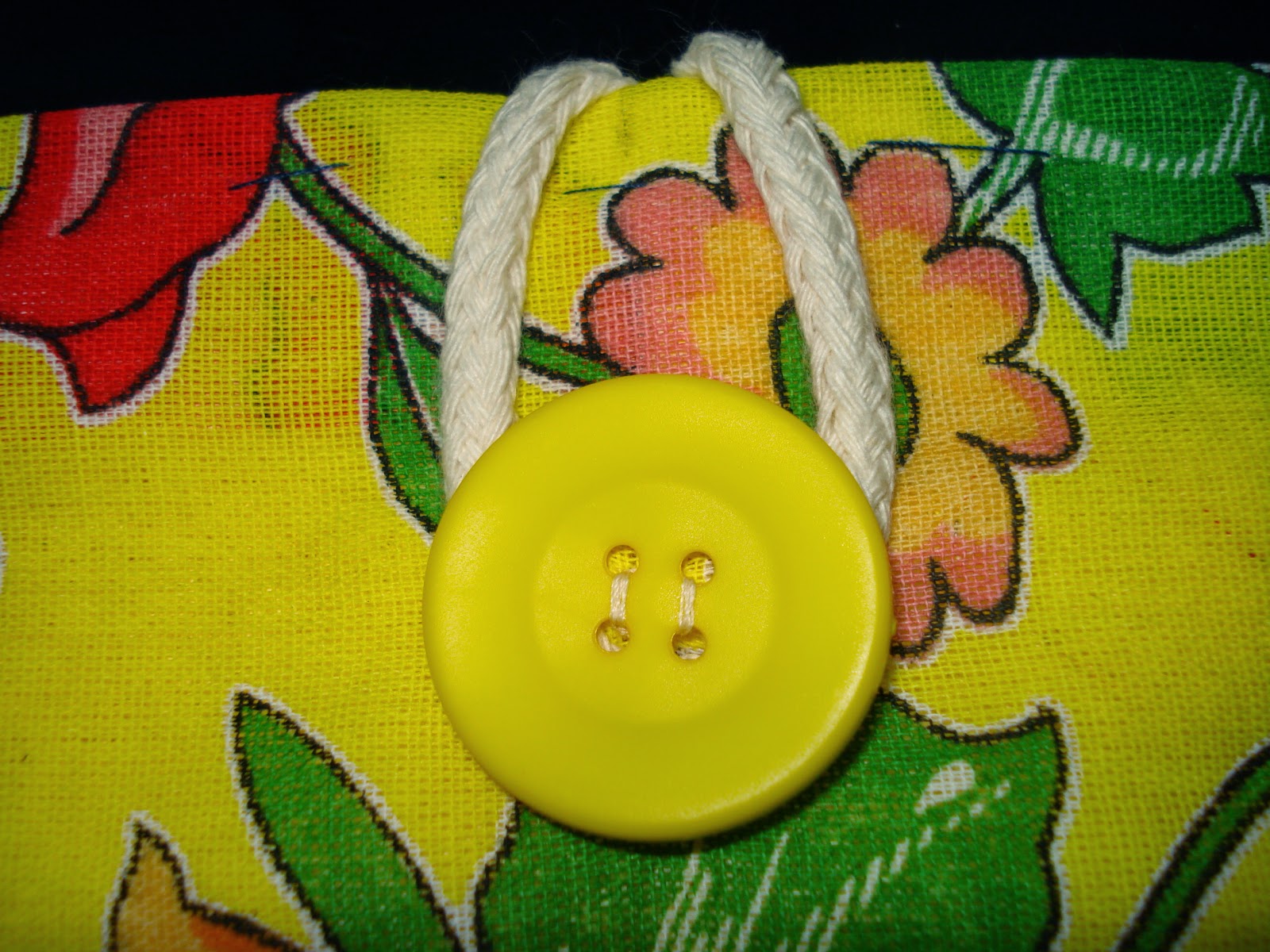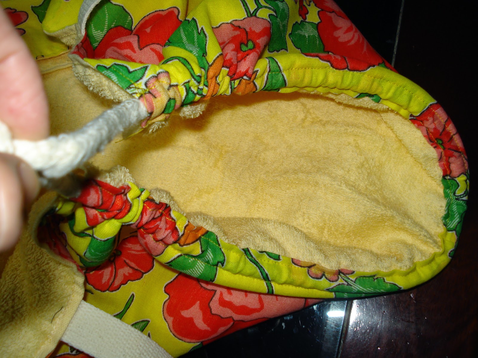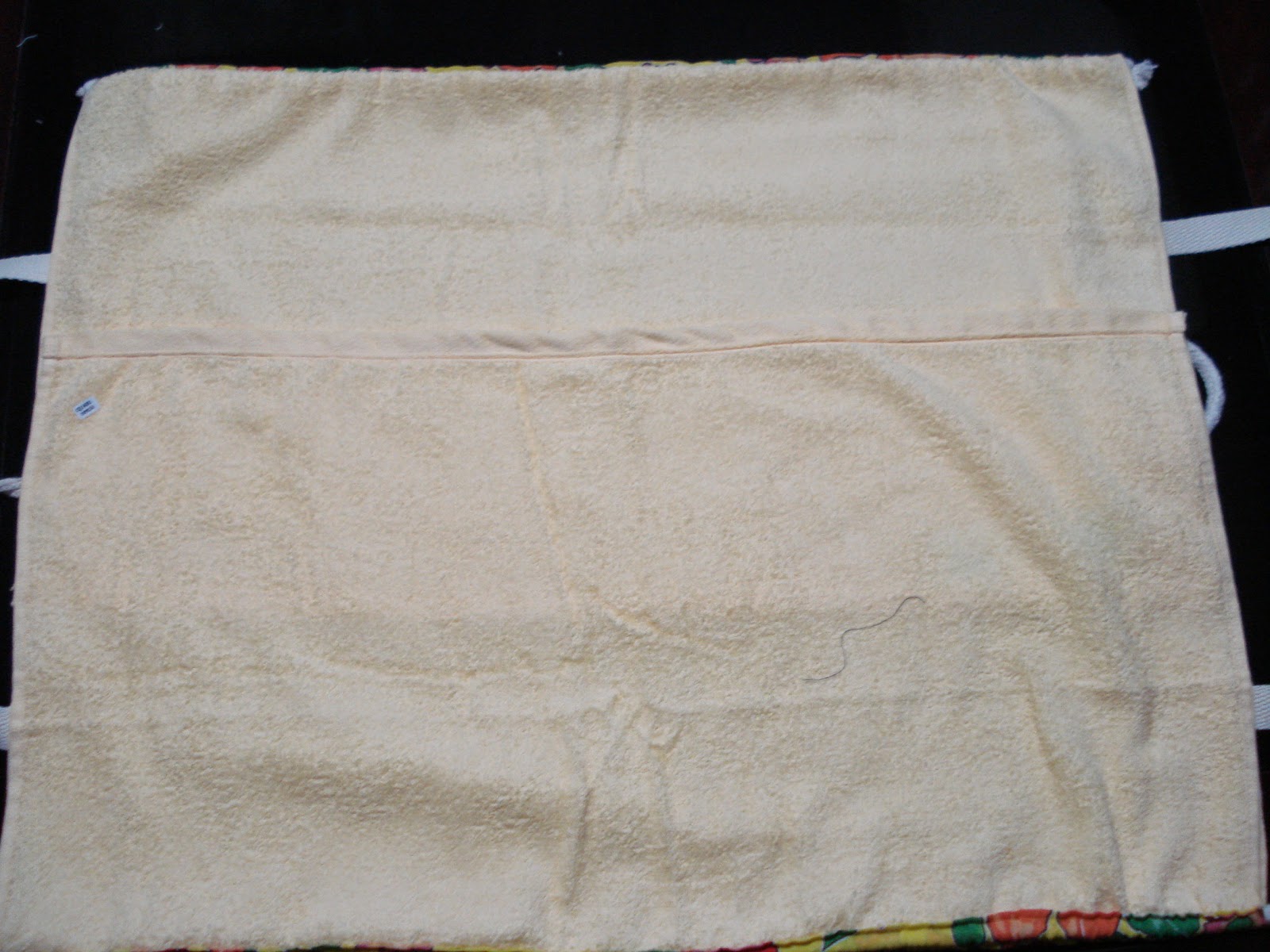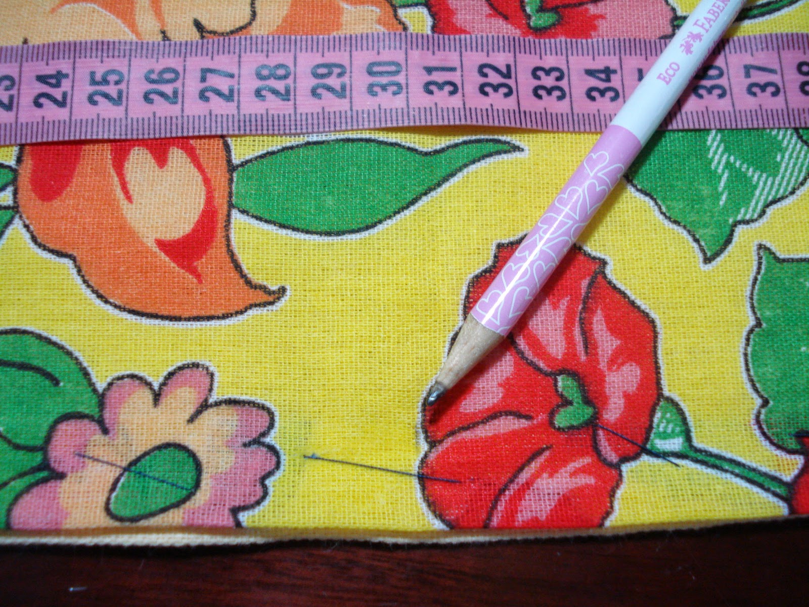 3. Marcar o centro no tecido e fixar o cordão para fechar a bolsa em uma lateral (entre a toalha e o tecido).