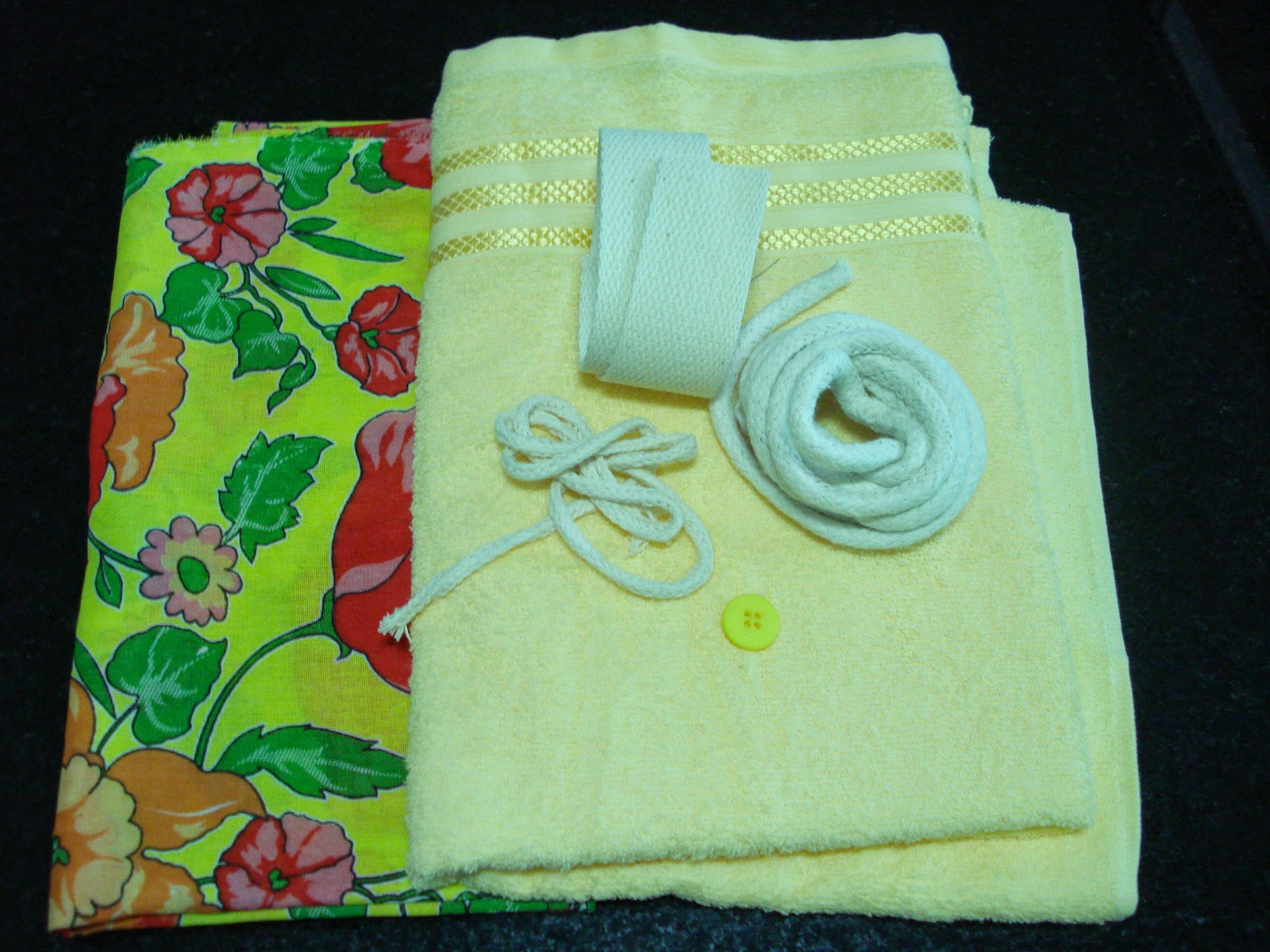 1. Toalha pelo avesso e tecido pelo lado direito. Marcar o centro da toalha e do tecido e alinhavar um no outro.