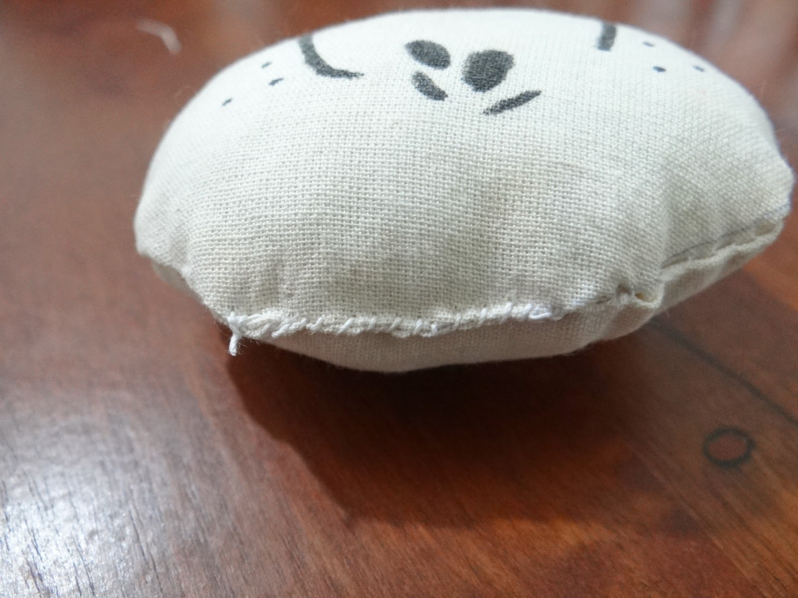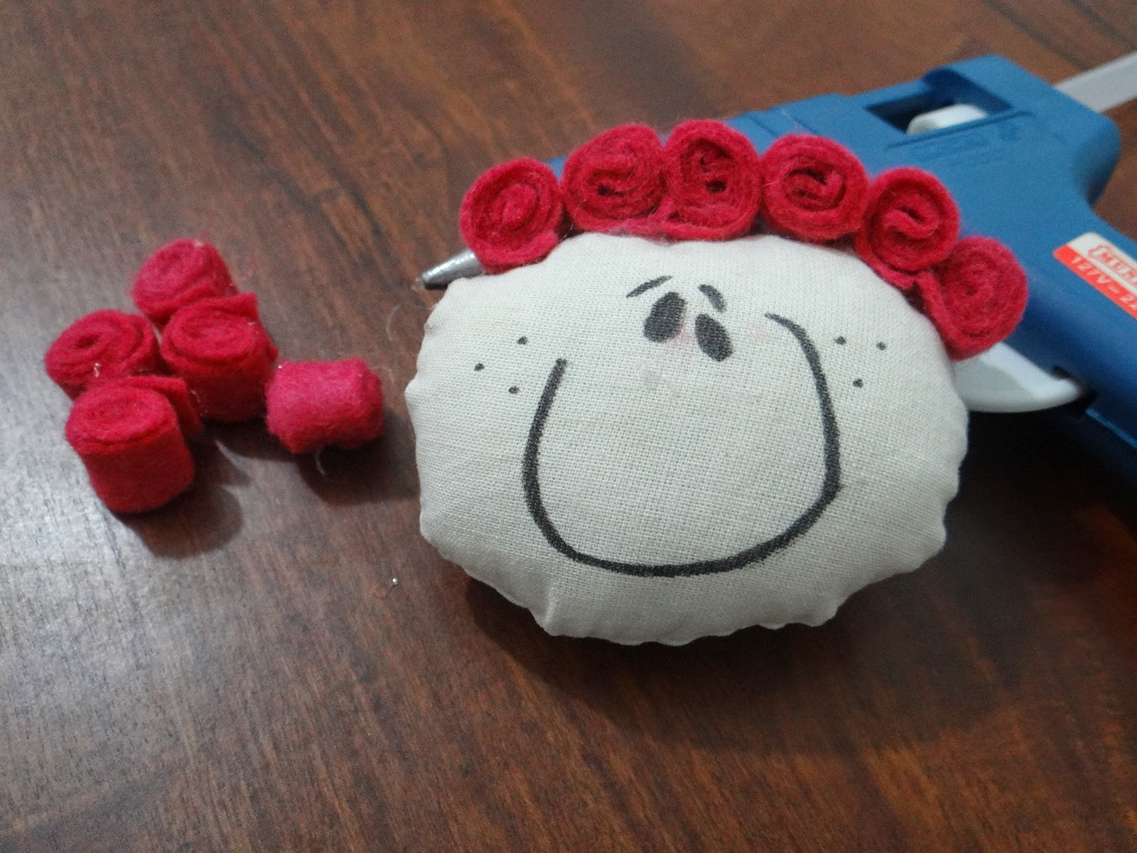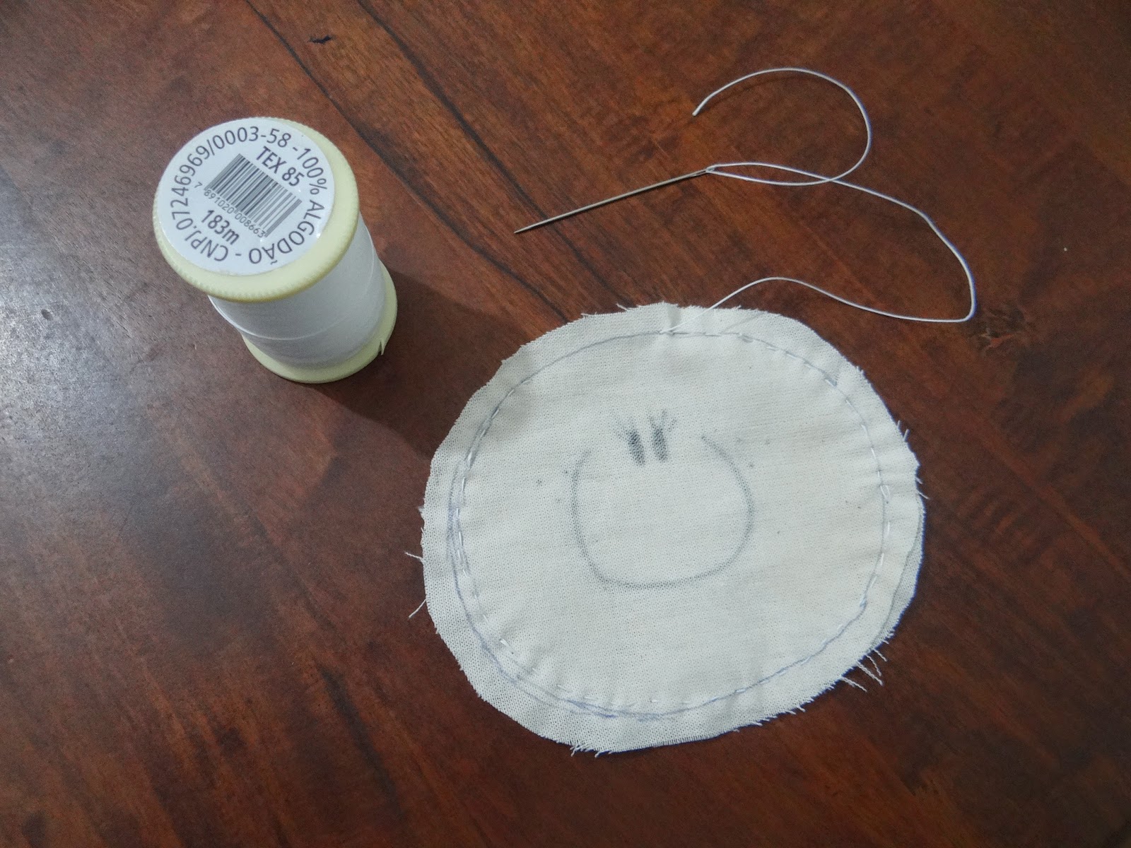 2. Desenhar o rostinho em um dos moldes cortados e uni-los (à mão ou à máquina). Deixar uma pequena abertura para virar o trabalho.