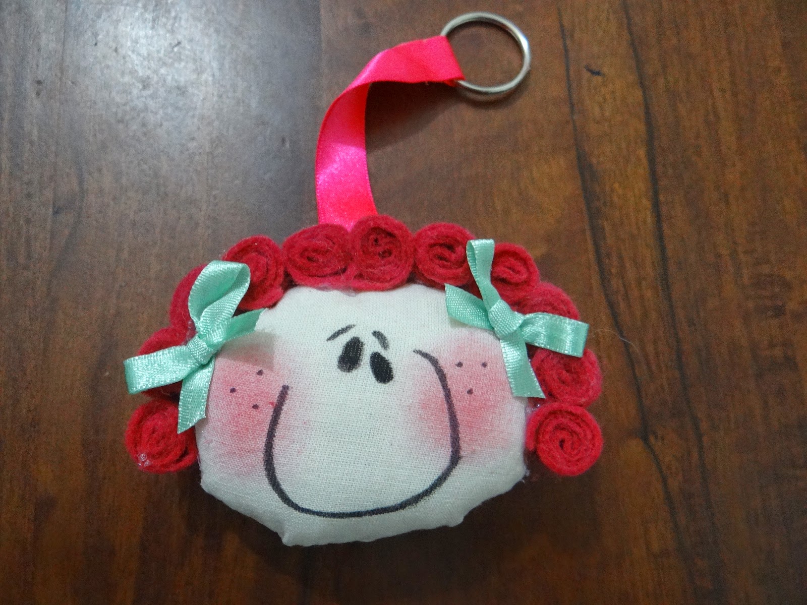 7. Agora é só colar a fita para ficar a argola do chaveiro, fazer uma linda maquiagem e colocar fitinhs coloridas pra enfeitar!