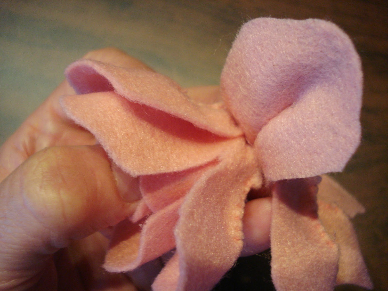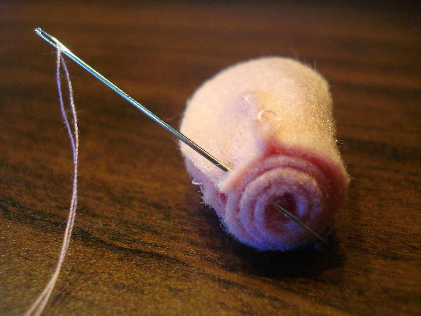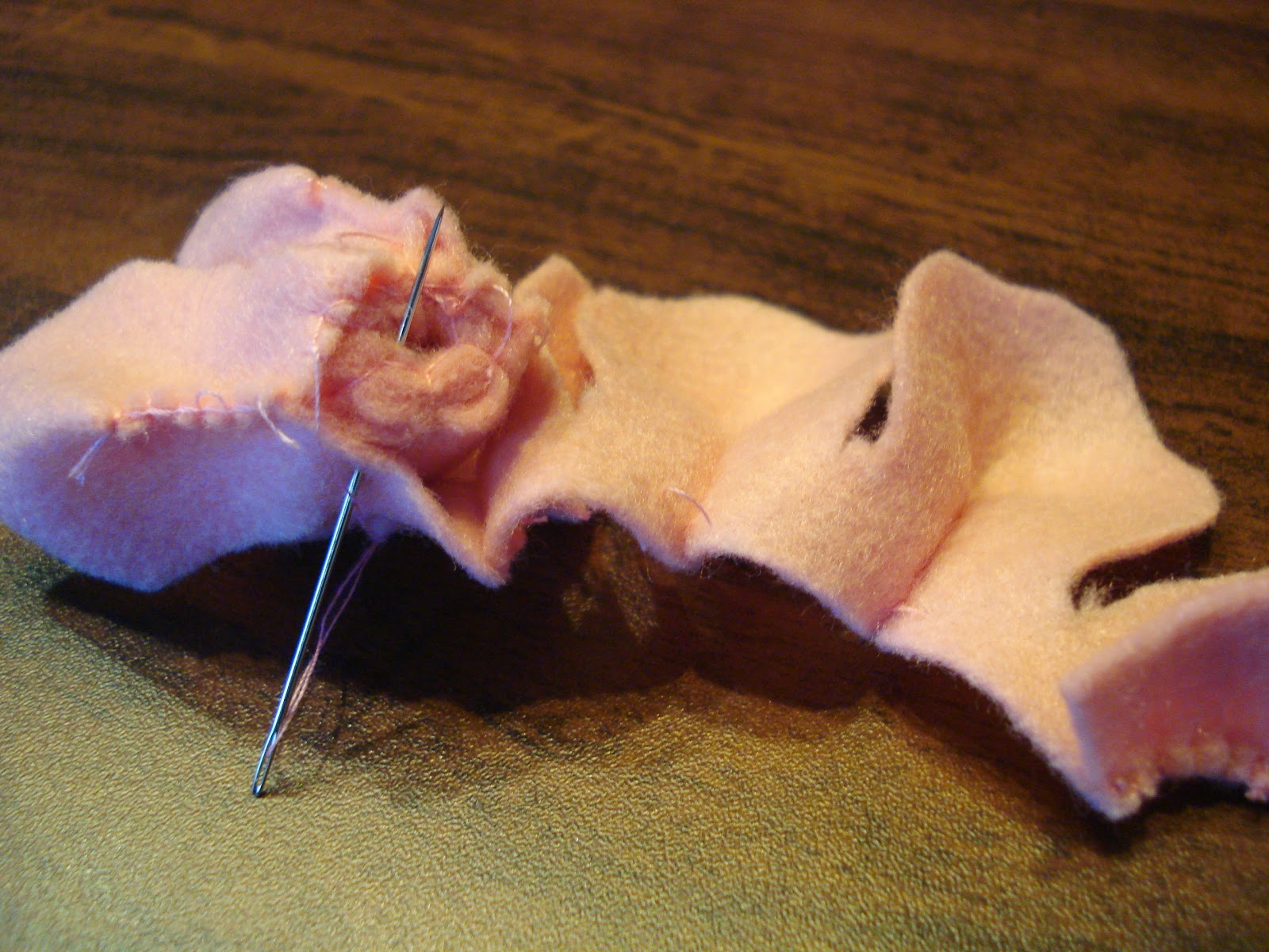 Enrolar a terceira camada de pétalas e prender, na base, com pontinhos.